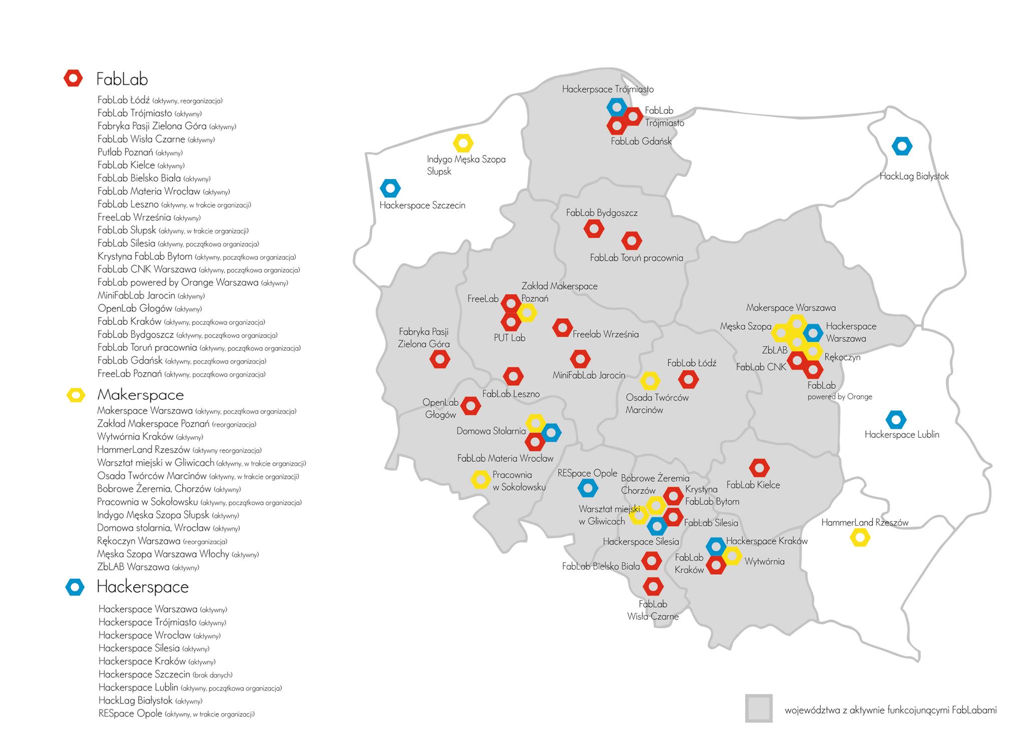 Od niedawna również w naszym kraju powstaje coraz więcej przestrzeni tego typu. Jeżeli macie taką możliwość, to najlepiej jest odwiedzić makerspace, fablab, czy hackerspace osobiście i zobaczyć, jak to wygląda na żywo. Na pewno na miejscu spotkacie organizatorów, którzy wszystko dokładnie wyjaśnią i pokażą. Poniżej znajduje się mapka przedstawiająca lokalizację różnych przestrzeni w Polsce: