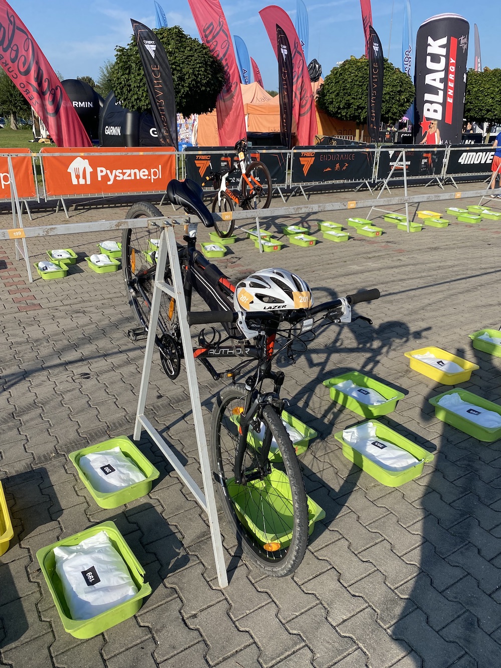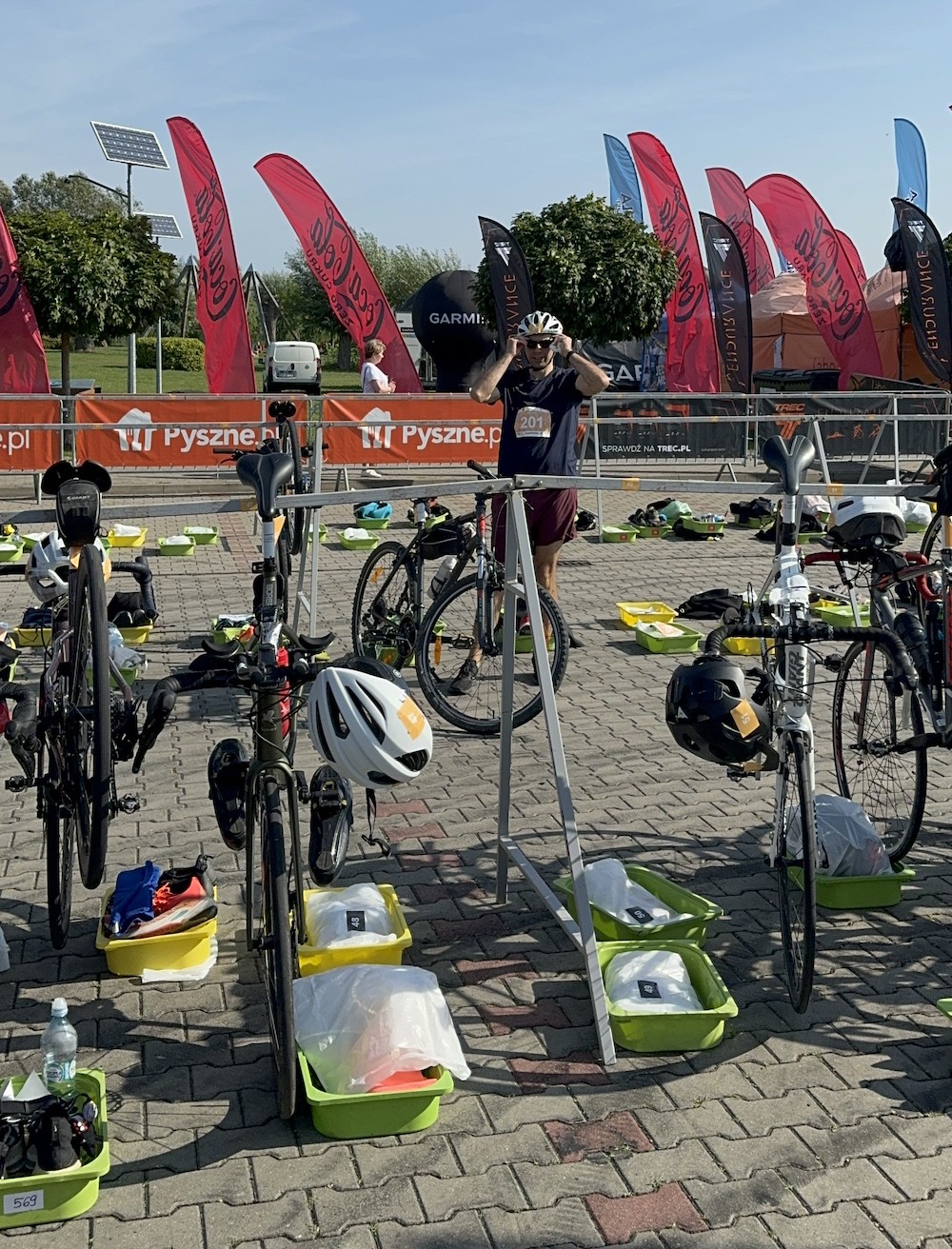 Również dzień wcześniej można zostawić rower w strefie zmian na swoim miejscu. Jest to bardzo dobra opcja, ponieważ oszczędzamy w ten sposób czas rano i nie trzeba niepotrzebnie stresować się kolejną rzeczą do załatwienia przed startem (a w moim przypadku start był bardzo wcześnie o 8:45). Na miejscu jest cały czas ochrona, więc nie ma obaw przed ewentualna kradzieżą. Oprócz stojaka na rower w strefie zmian każdy ma do dyspozycji “kuwetę”, gdzie składamy resztę swojego sprzętu jak np. strój do biegania, buty, kask, ręcznik, wodę, żele energetyczne itd.