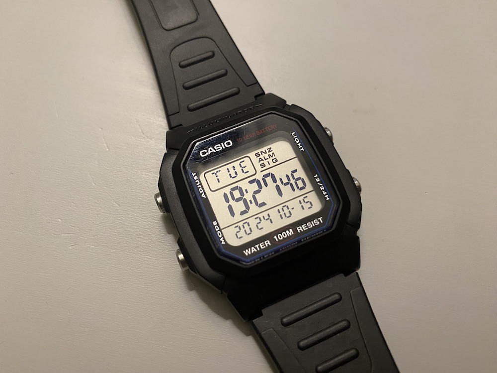 Kultowy zegarek Casio W-800H z dużym wyświetlaczem i stoperem 24h, który idealnie sprawdził się na zawodach.
